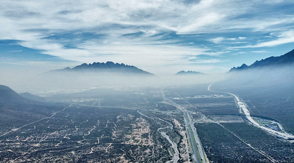 Los picos de los cerros apenas escapan a la nube de contaminación que ahoga al área metropolitana de Monterrey.