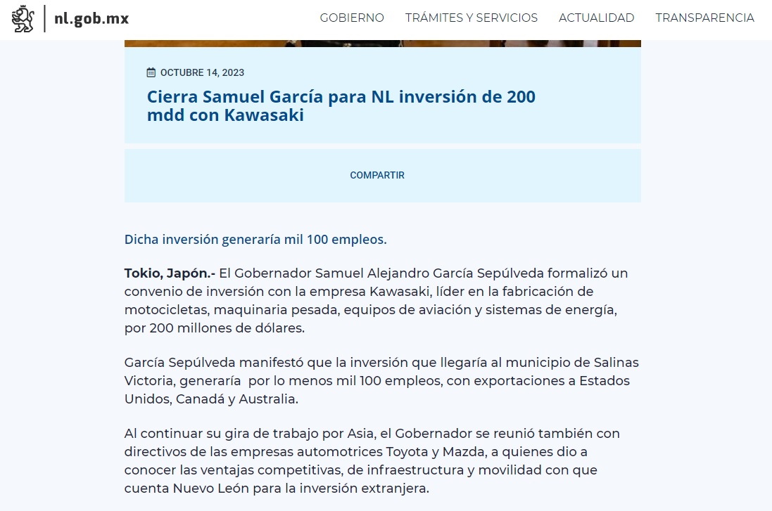 “El Gobernador Samuel Alejandro García Sepúlveda formalizó un convenio de inversión con la empresa Kawasaki, líder en la fabricación de motocicletas, maquinaria pesada, equipos de aviación y sistemas de energía, por 200 millones de dólares”, de acuerdo con un comunicado del Gobierno del Estado.