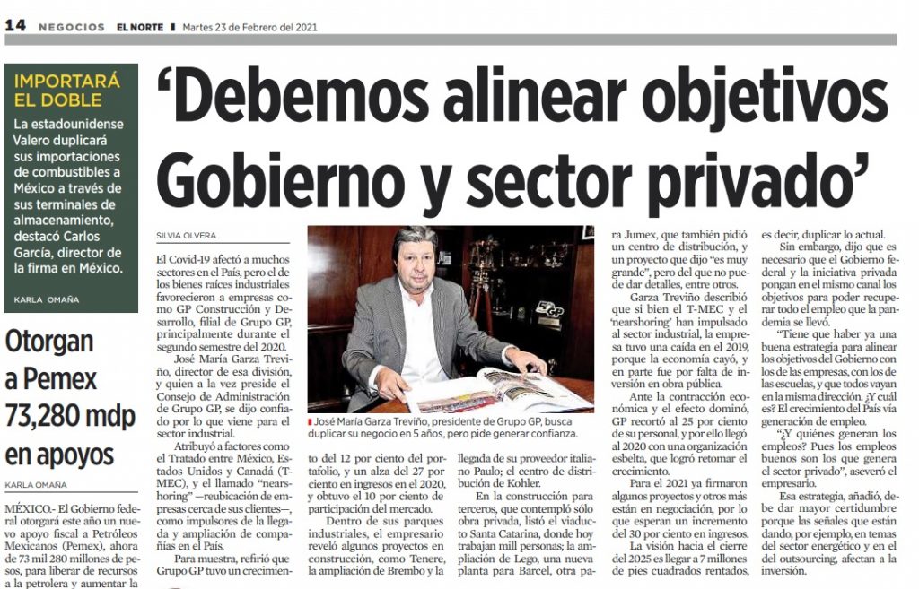 El Norte publica una entrevista con José María Garza Treviño titulada “Debemos alinear objetivos gobierno y sector privado”, donde el empresario reveló que entre los proyectos en construcción en sus parques están Tenere, la ampliación de Brembo y la llegada del proveedor italiano Paulo, además del centro de distribución de Kohler.