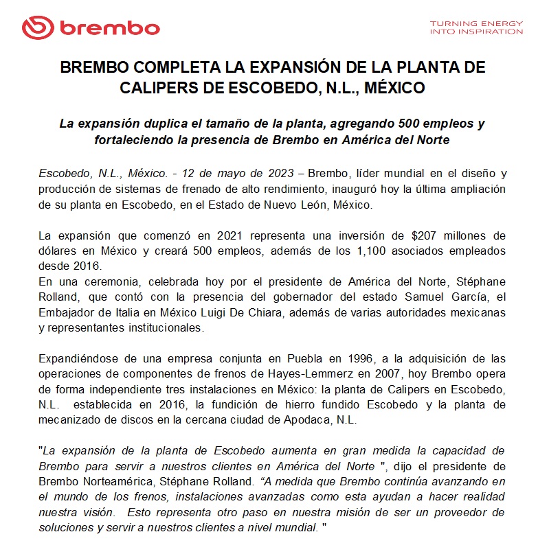 “Brembo, líder mundial en el diseño y producción de sistemas de frenado de alto rendimiento, inauguró hoy la última ampliación de su planta en Escobedo, en el Estado de Nuevo León, México. La expansión que comenzó en 2021 representa una inversión de $207 millones de dólares en México… La expansión de Escobedo de 30 mil metros cuadrados duplica la producción de la fábrica”, se lee en un comunicado oficial de la compañía italiana.
