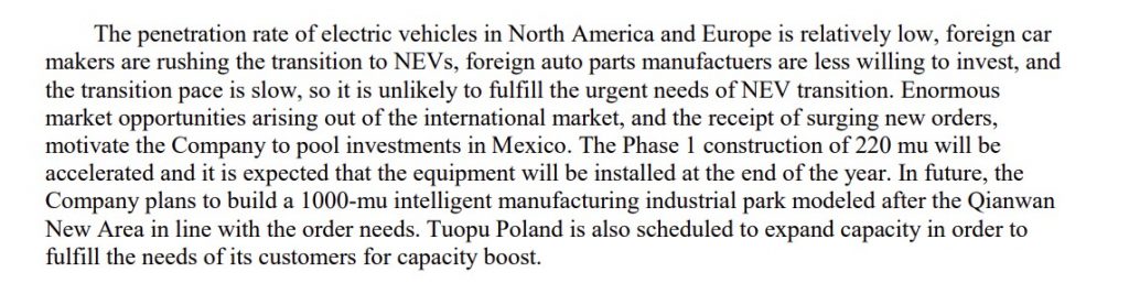 En su reporte anual del 2023 mencionan que, en septiembre del 2022, la compañía estableció una nueva empresa subsidiaria de propiedad absoluta de nombre Tuopo Group México, que en marzo adquirió un terreno industrial dentro del Parque Hofusan en Nuevo León.