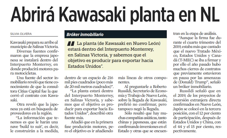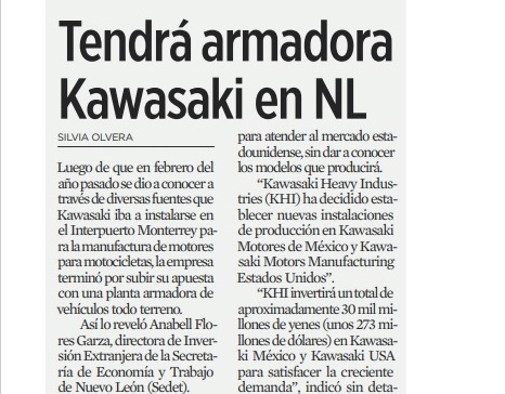 “El Gobernador Samuel Alejandro García Sepúlveda formalizó un convenio de inversión con la empresa Kawasaki, líder en la fabricación de motocicletas, maquinaria pesada, equipos de aviación y sistemas de energía, por 200 millones de dólares”, de acuerdo con un comunicado del Gobierno del Estado.