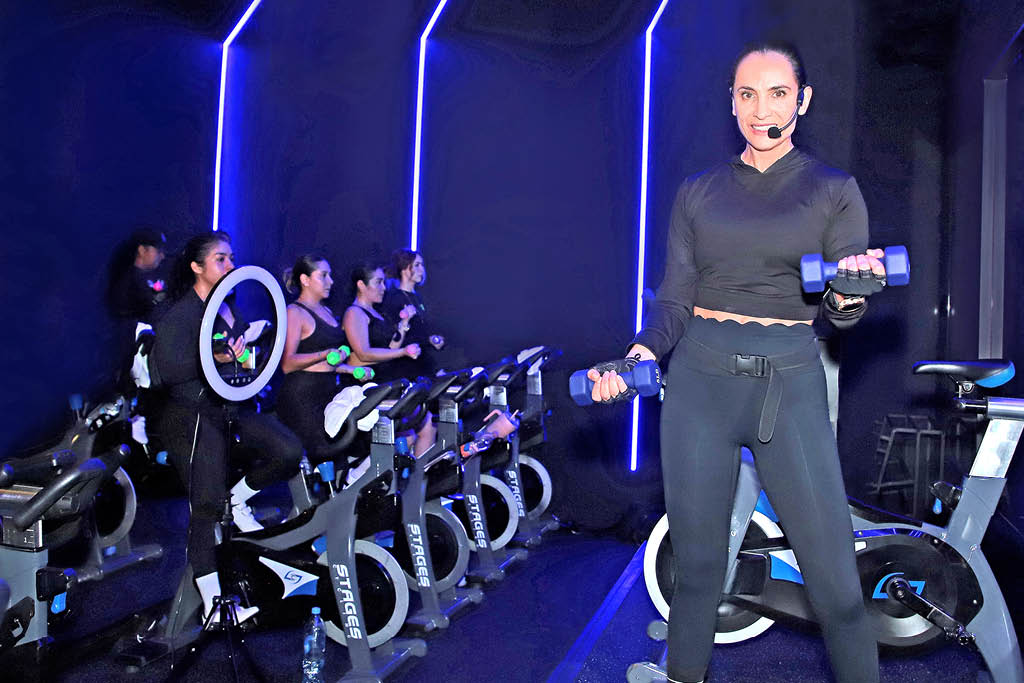 “Esto ya no se llama spinning, es cycling con prop; este último puede ser con varios objetos, como barras, ligas, toallas, pero nosotros utilizamos mancuernas y nos enfocamos en que el tronco inferior está pedaleando, mientras que el superior monta coreografías”, explicó Angie Ayub, formadora de coaches cycling.